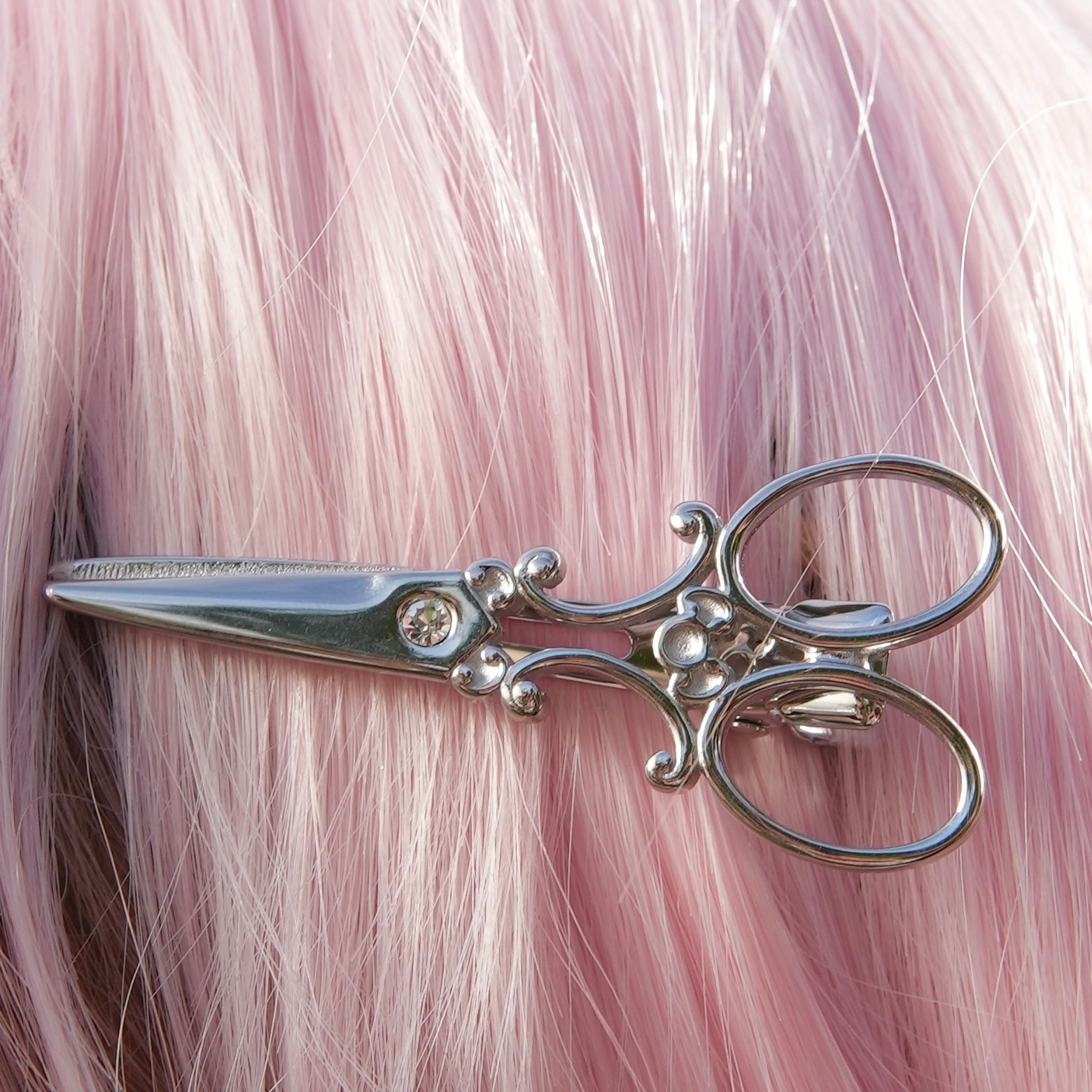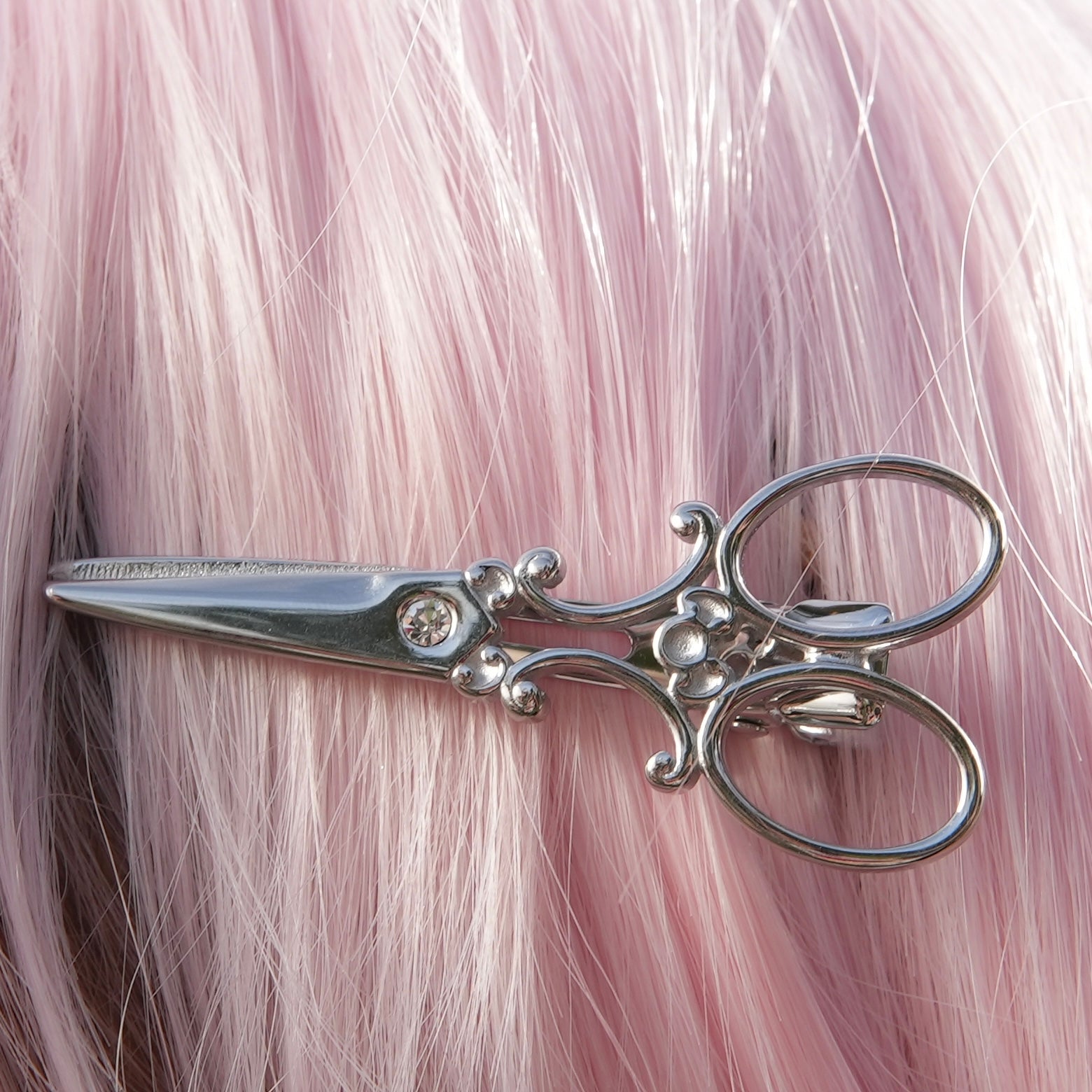 antique scissor stainless steel hair clip design with gemstone detail and alligator clip closure. waterproof and tarnish proof 。𖦹°‧